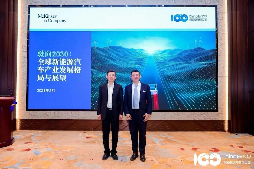 会议期间,中国电动汽车百人会与麦肯锡共同发布了联合研究报告《驶向2030:全球新能源汽车产业发展格局与展望》。中国电动汽车百人会副理事长兼秘书长张永伟(图左)和麦肯锡全球董事合伙人、麦肯锡中国区汽车咨询业务负责人管鸣宇(图右)共同出席。
