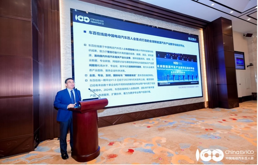当日,中国电动汽车百人会知识中心负责人、车百在线总经理崔桂林也做了车百在线平台介绍。他表示,车百在线基于中国电动汽车百人会车百智库的高水平研究资源与知识成果,致力于整合行业内外高质量的信息、数据、洞见、研究资源,面向国内外的汽车相关产业从业者,提供涵盖资讯、政策、行业数据、专业研报、网络研讨会与课程等多样化内容的知识产品订阅服务和高水平、专业化、数字化的定制研究服务,助力从业者洞悉产业趋势、服务企业科学决策。全面、专业、及时、国际化与“用数据说话”是车百在线的特色。