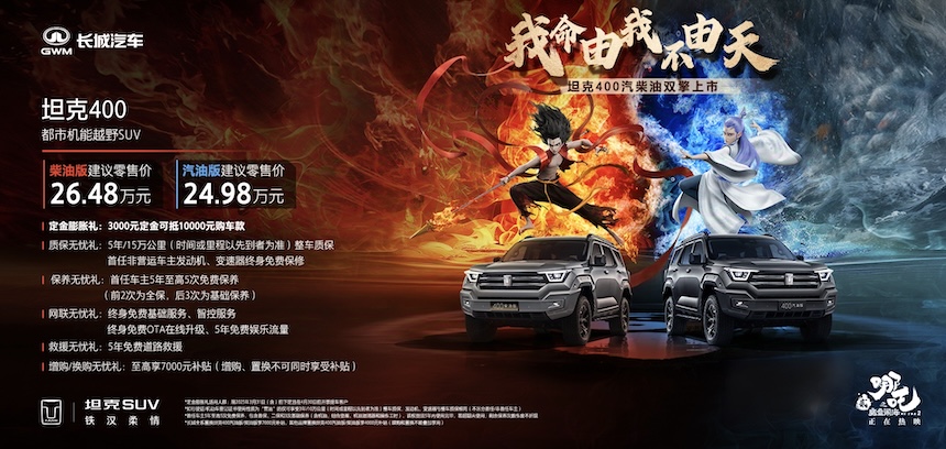 坦克品牌执行副总经理谷玉坤表示:“坦克400柴油版就像《哪吒2》中的魔丸,性能强大、天生神力,适合喜欢户外穿越、拖挂出行的硬核玩家。坦克400汽油版就像灵珠一样,可靠稳重、锐不可当,无惧全场景的挑战,让更多用户在各自的使用工况下得到更极致的体验。”