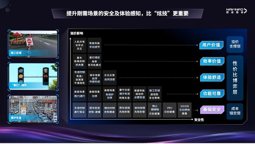 从马斯洛需求理论为纲,四维图新产品团队搭建从底层安全-功能可靠-体验舒适-效率价值-用户价值的五层金字塔模型,解析用户对于驾驶辅助系统相关产品的需求,将安全的刚性约束,作为最基础的必须坚守的安全底线。