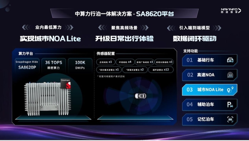 此次上海车展,四维图新发布多款行业领先产品,进一步丰富了产品矩阵。在行泊一体方案方面,四维图新依托Snapdragon Ride™平台(SA8620P)的异构计算架构和高性能表现,通过算法优化显著提升算力利用率,在确保系统安全性和功能可靠性的基础上,以极致性价比实现行泊一体,并支持城区NOA Lite功能。