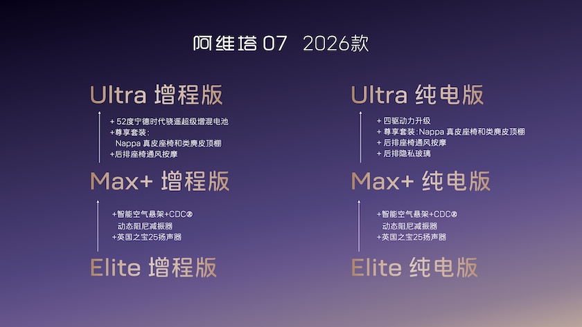 阿维塔07 2026款Elite版可选购ADS高阶功能包,进一步推动智能化平权,让更多消费者享受到高阶辅助驾驶体验,加速辅助驾驶全民普及。此外,原Max版车型焕新升级为Max+版,标配智能空气悬架、CDC动态阻尼减振器,中配即可享受满血太行智控底盘,滤震更精准,弯道更灵动,湿滑路面更沉稳,兼顾舒适、操控与安全,重塑中型SUV价值锚点。