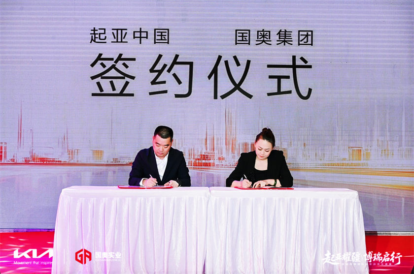 开业典礼上,悦达起亚与国奥集团代表共同签署了战略合作授权协议。