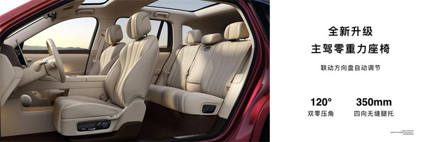 座椅舒适性是其亮点之一。主驾驶位升级为零重力座椅,可与电动方向盘联动智能调节,提供出色的放松姿态。副驾驶位配备准零重力座椅,支持多模式调节及按摩、通风、加热功能。大五座版本的第二排腿部空间和头部空间宽敞,座椅采用高级Nappa真皮与多层工艺制作,支持双人沙滩椅模式和大床模式,空间灵活性高。享六座版本的第二排为零重力座椅,第三排空间也力求舒适。纯电版车型还提供了145升超大前备箱。大五座后备箱容积达850升,享六座版本为312升,全车设有大量储物空间。