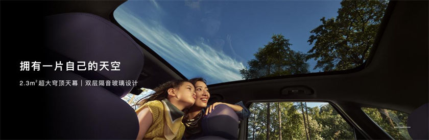 座舱顶部配备2.3㎡超大穹顶天幕,结合双层隔音玻璃,为驾乘者带来开阔通透的视觉享受与静谧环境;所配备的全遮光电动遮阳帘采用五层超厚复合材料设计,能够实现100%的物理遮阳效果与99%的紫外线隔绝率,不仅遮阳效果平整美观,而且经久耐用。