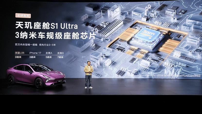 深蓝汽车董事长邓承浩在预售发布会后谈及芯片选择时表示:“未来汽车芯片的要求将超过手机。汽车车机的芯片一定要选择高能级的芯片,才能支撑复杂的感知与融合处理能力。”这一理念在L06上得到充分体现。新车全球首发了3纳米车规级座舱芯片,与苹果最新A18芯片相同制程,是世界上首次将汽车车规级座舱芯片与全球顶级手机芯片做到同一制程水平。