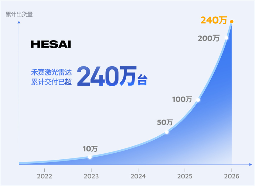 禾赛已连续五年全年交付量翻番。2025 年,禾赛全年交付量超 160 万台,单月最高交付量超 20 万台,ADAS 产品全年交付量约 140 万台,机器人产品全年交付量超 20 万台,爆款产品 ATX 开启交付首年即突破 100 万台,全系激光雷达产品历史累计交付量已超 240 万台。