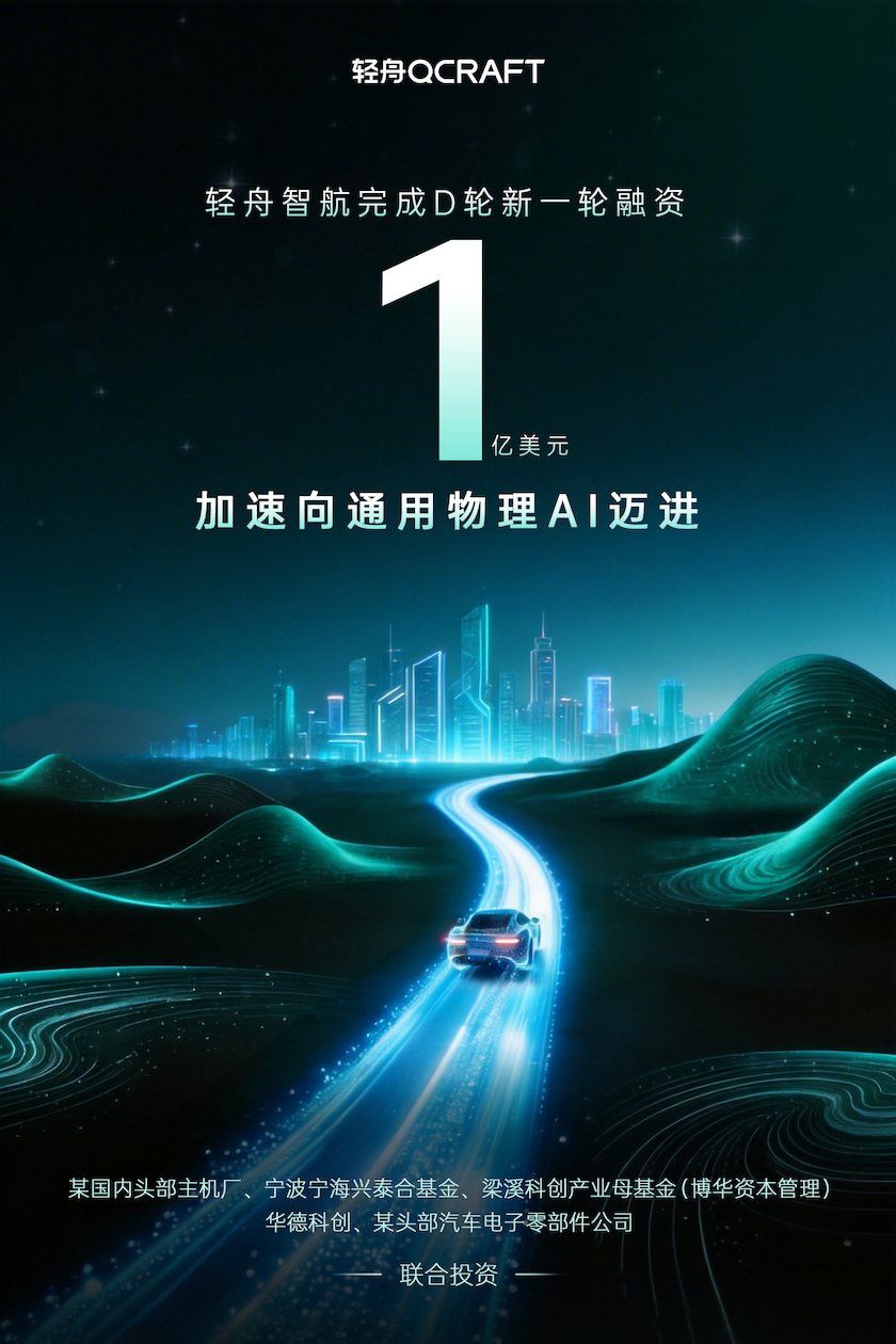 3月23日,轻舟智航(QCraft,以下简称“轻舟”)宣布完成D轮新一轮融资1亿美元。本轮融资由某国内头部主机厂、宁波宁海兴泰合基金、梁溪科创产业母基金(博华资本管理)、华德科创、某头部汽车电子零部件公司等重磅产业投资方及投资机构联合投资。资金一方面用于加大世界模型+强化学习等前沿物理AI技术研发,另一方面加大公司组织人才建设,为公司发展储备力量。