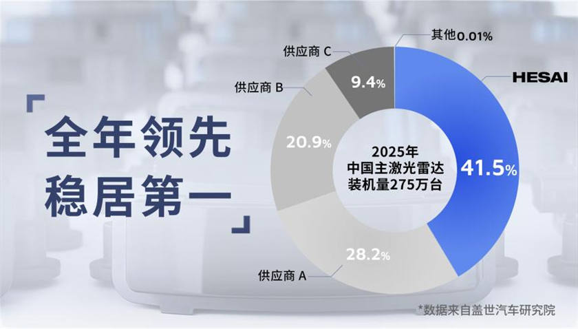 截至目前,禾赛已获 40 家汽车品牌超过 160 款车型的量产定点,覆盖中国销量前十的全部汽车品牌,并已斩获前两大 ADAS 客户 2026 年全系车型定点合作。2025 年,禾赛在 ADAS 主激光雷达市场以超 40% 的份额稳居第一,装机量是行业第二名的近 1.5 倍、第三名的近 2 倍,总装机量已连续五年翻番。