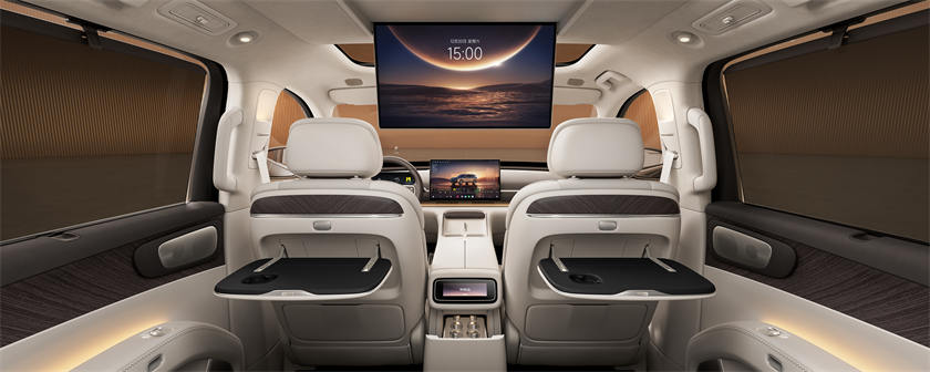 座椅采用12层奢享级结构,全车座椅支持电动调节,并实现6座加热、4座吸入式通风与10点式按摩,二排右侧零重力座椅支持120°零压躺姿、4向腿托与ABTS一体式安全带,1.9米乘员也能享受悬浮式休憩体验。第三排为同级超大贵宾座,支持131°靠背无极调节、座椅加热与一键电动翻折,搭配专属双扶手与全平地台,彻底解决传统三排“小板凳”痛点。此外,二/三排专属遮阳帘遮蔽率分别达93.2%、91%,全方位兼顾舒适与隐私。
