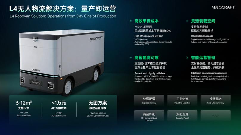 具体来看,轻舟智航L4级无人物流车的单车自动驾驶解决方案成本低于1万元,同线路平均运营成本较人工可降低50%以上,支持全天候运营。在安全性上,百万台NOA量产上车所沉淀的数据反哺L4训练,AI系统在应对拥挤街巷、混合交通以及各类长尾场景时,具备经过规模化验证的安全可靠驾驶能力。方案覆盖3至12立方米多种装载空间,可灵活适配快递配送、冷链配送、商超即配、工业物流、安防巡逻等多种场景。