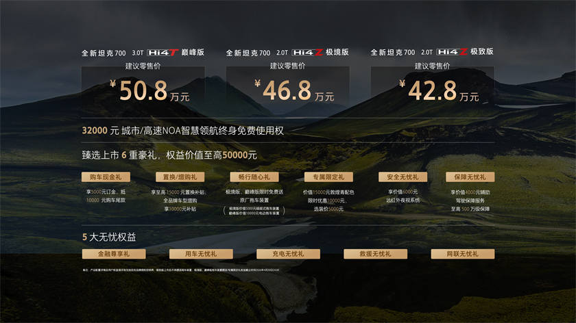 4月20日,全新坦克700在保定爱情城酒店上市,售价42.8万元起。 发布会主题为“麒麟云中现·境启新人生”,从卖产品转向卖生活方式。同时,坦克品牌发布高端社交平台“麒麟荟”,包含“百大主理人”计划与“麒麟私董会”,为用户提供全维度价值赋能。