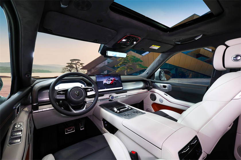 造型设计方面,前机盖造型取自麒麟昂首,命名为“尊骨机盖”;大灯为全球首创机械旋转开合式激光大灯,命名“瑞麟之眼”;尾翼为硬派越野专属尾翼“祥麟焰尾”,灯光从尾翼两侧点亮;车色“敦煌青”取自青金石原色。