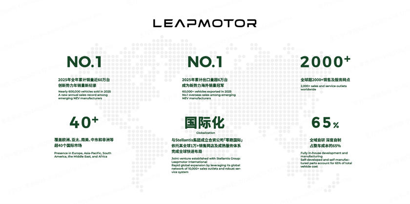 借助Stellantis集团资源,零跑已完成全球七大板块体系化布局,业务覆盖超40个国家和地区,渠道建设超2000家。2026年一季度海外出口批售量超4万台,欧洲16个国家上牌量2.33万台,同比增长726.5%;在欧盟12国中,零跑纯电销量约1.7万台,位列中国纯电品牌第一。今年将在海外上市A10、B10、Lafa5三款车型,Lafa5将于6月起在海外发布。零跑国际在成立第二年实现年度盈利。